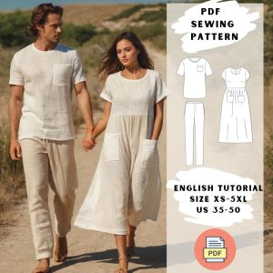 Couple’s Linen Outfit Sewing Pattern PDF – Men’s Linen Shirt – Women’s Patch Pocket Linen Dress XS-5XL – Summer Matching Set